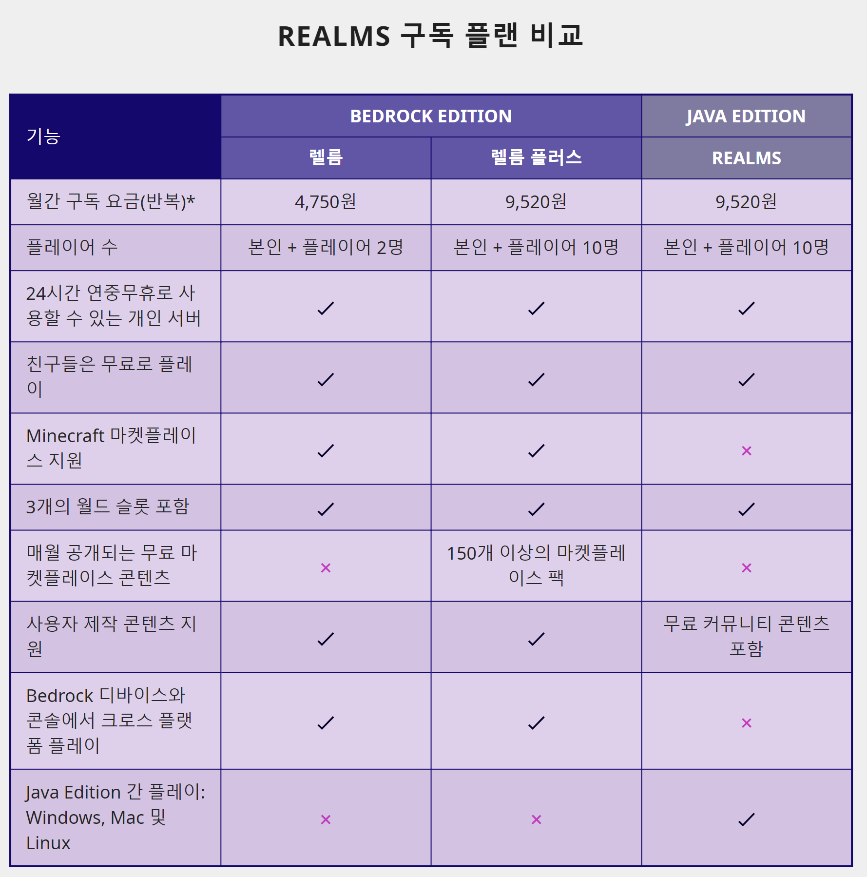 자바 에디션은 요금제가 하나밖에 없는 반면, 베드락 에디션은 일반 렐름과 렐름 플러스 두개의 요금제가 있습니다. 밑의 표를 참고하시기 바랍니다.