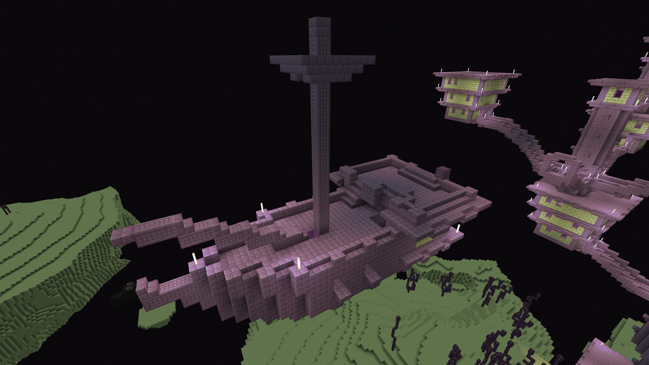 엔드 게이트웨이를 통과하면 칠흑 같은 공허에 수많은 엔드 섬이 떠 있는 광경을 마주하게 됩니다. 이곳에서 우리는 보라색 블록으로 이루어진 기묘한 구조물, '엔드 시티(End City)'를 찾아야 합니다.